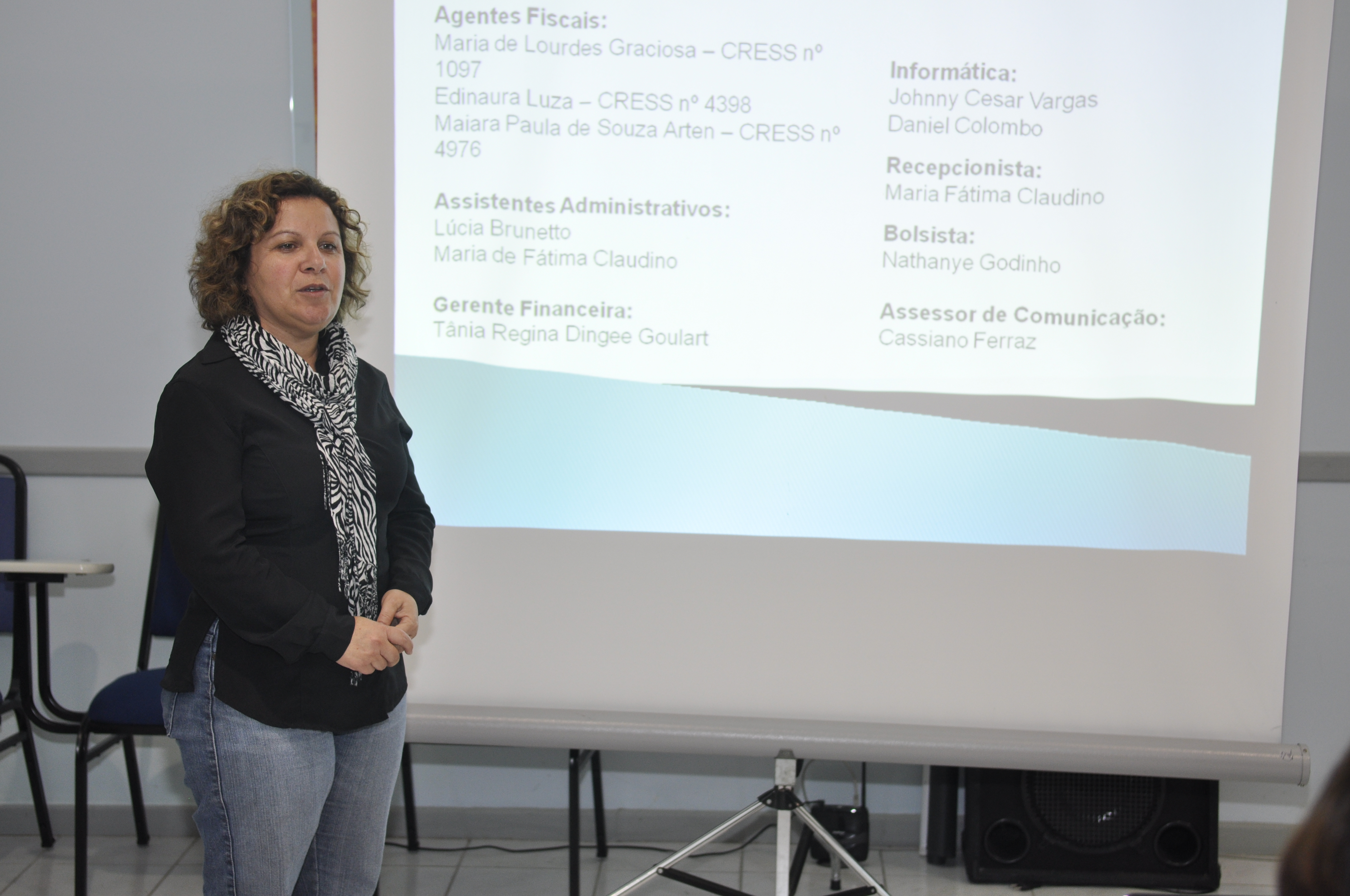 Dando continuidade foi apresentado os membros da atual gestão “Ética e Autonomia para Avançar na Luta”, diretoria e conselho fiscal, a equipe de trabalho do CRESS 12ª Região e as Comissões Permanentes e Temáticas.
