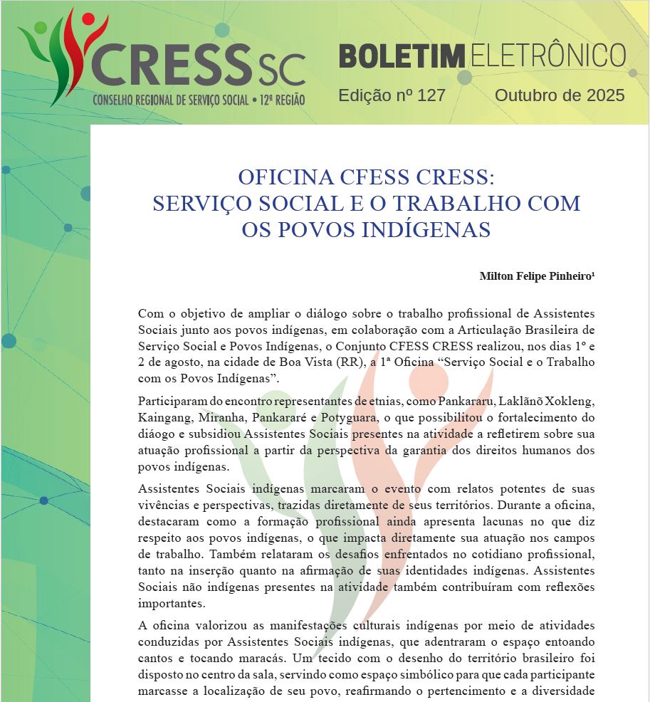 A edição 127 do Boletim Eletrônico apresenta o artigo elabora por Milton Felipe Pinheiro, indígena Assistente Social graduado pela UFSC, mestrando no Programa de Desenvolvimento