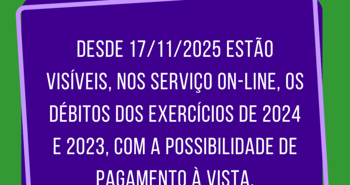 Desde 17/11/2025 estão visíveis, nos serviço on-line, os débitos dos exercícios de 2024 e 2023, com a possibilidade de pagamento à vista.