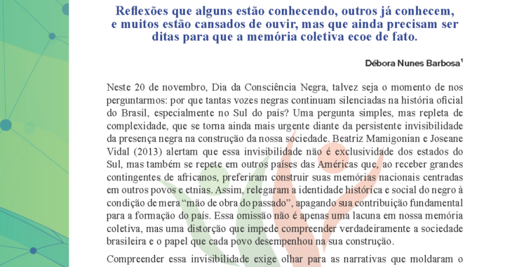 Neste dia 20 de novembro, dia da Consciência Negra, o Conselho Regional de Serviço Social de Santa Catarina apresenta, em seu Boletim Eletrônico, o artigo da Assistente Social Débora Nunes Barbosa.