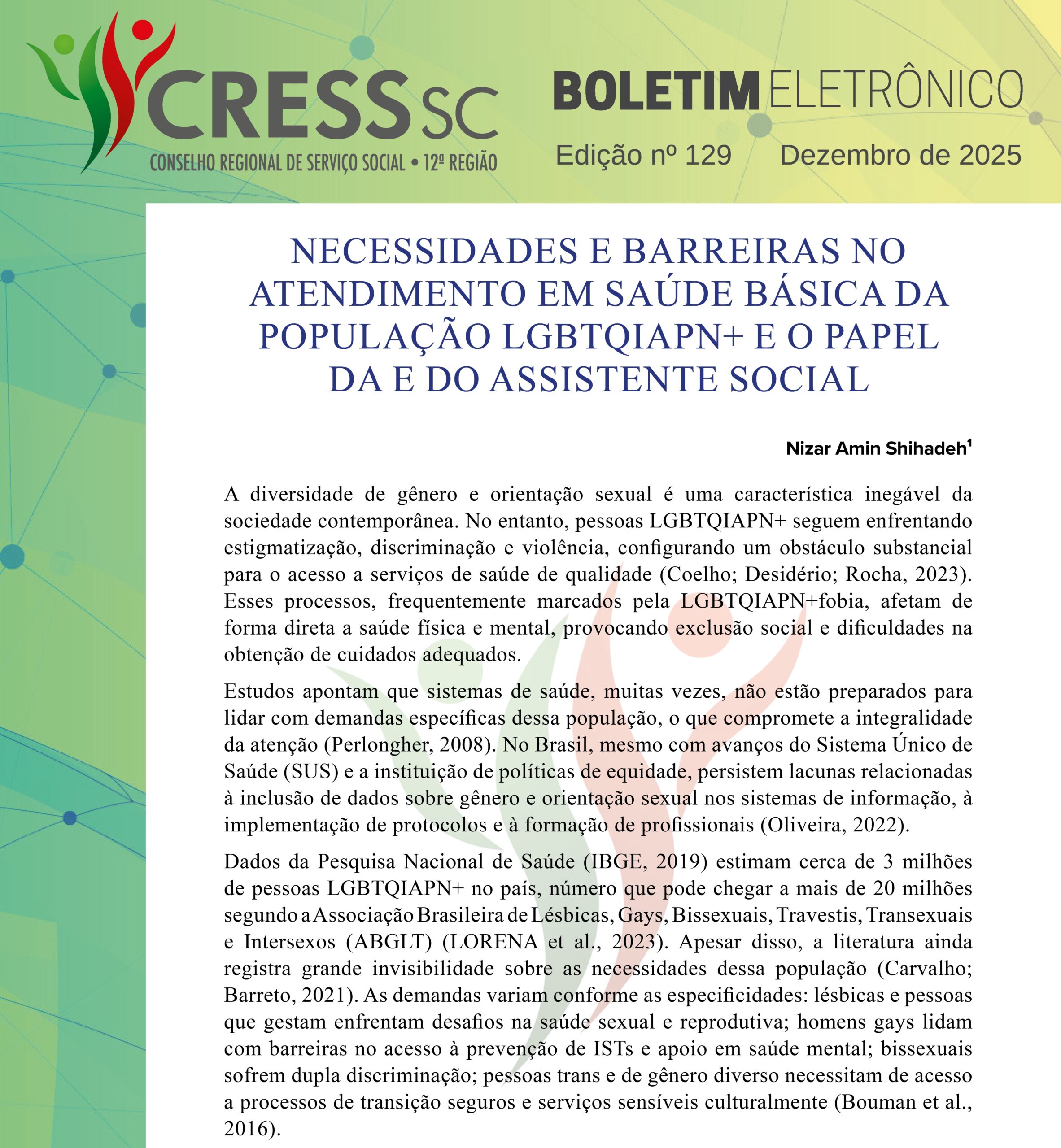 O Conselho Regional de Serviço Social de Santa Catarina convida todas as pessoas a fazerem a leitura do Boletim Eletrônico nº 129, que traz como tem: Necessidades e Barreiras no Atendimento em Saúde Básica da População LGBTQIAPN+ e o Papel da e do Assistente Social.
