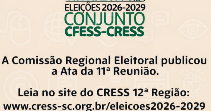O CRESS 12ª Região informa que a Comissão Regional Eleitoral publicou a Ata referente a 11ª reunião, realizada na data de hoje (19/02/26).