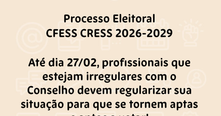 Conforme o calendário eleitoral, profissionais que estão irregulares com seus conselhos tem até o dia 27 de fevereiro para regularizar suas pendências junto ao CRESS e, assim, estarem aptas e aptos a votar nas Eleições do Conjunto CFESS CRESS 2026-2029.