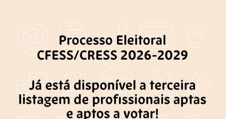 Processo Eleitoral CFESS/CRESS 2026-2029 Já está disponível a terceira lista de profissionais aptos e aptos a votar! Acesse o Portal da Transparência do CRESS SC e confira! (Acesse aqui) Acesse o arquivo em pdf por […]