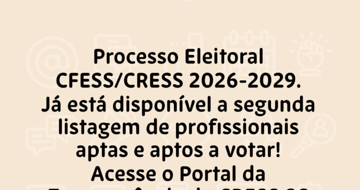 Processo Eleitoral CFESS/CRESS 2026-2029 Já está disponível a segunda listagem de profissionais aptas e aptos a votar! Acesse o Portal da Transparência do CRESS SC e confira! Acesse por meio do endereço https://abre.ai/oJYA CRESS 12ª […]